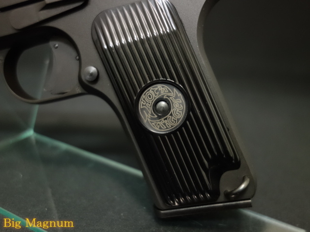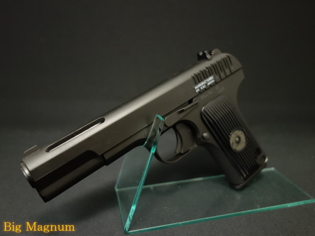 反動を低減するガス排気穴を12カ所も設けたエキゾーストポート型バレルや、それを覆うスライドに2列のワイドスリットを再現した威圧的なディテールと、ユーゴスラビア製クローンが装備する「トリガーセフティ」の再現により、G17のように直感的なハンドリングを実現したモダンなTT33カスタムで、ショートレンジの速射に追従する即応性を獲得しました。また、一見すると純正タイプのグリップは、旧ソ連の星印があるべきところがタギング風の刻印に変更されており、M1911(ガバメント)など他機種でポピュラーな改造をあえてトカレフに施したガンスミスの遊び心を演出しています。重厚なHW製ボディとシステム7エンジンの豪快なブローバックも見所です。